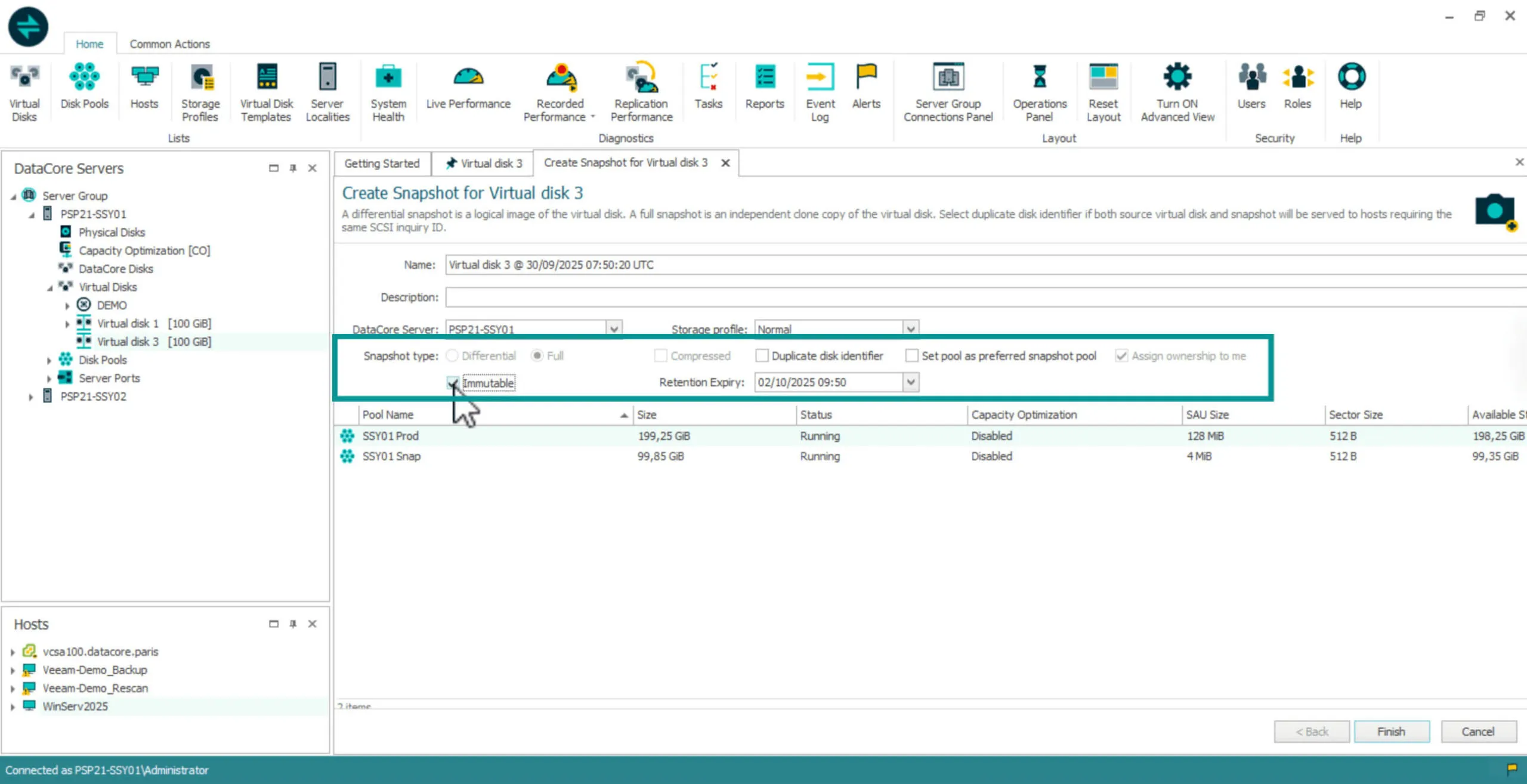 Creating an Immutable Snapshot in SANsymphony begins like any standard snapshot operation: from the Virtual Disk Details page, select Create Snapshot. When you enable the Immutable checkbox, SANsymphony automatically converts the snapshot type to Full, since immutability requires a complete, independent image of the source.