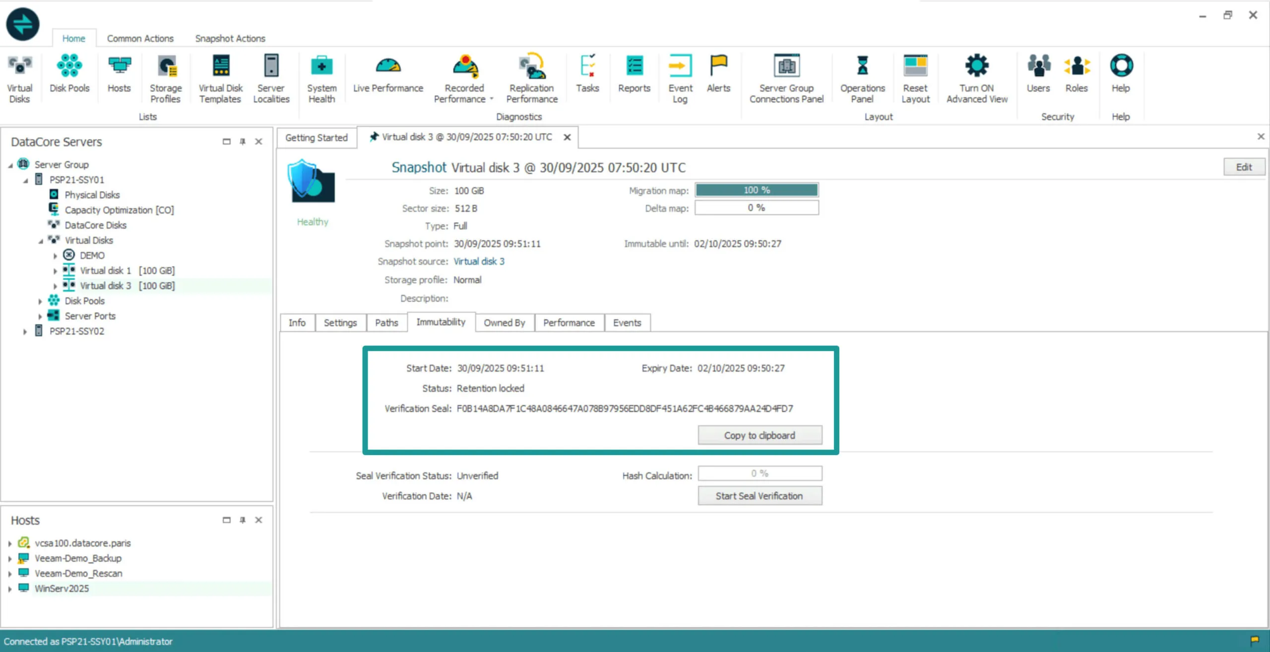 Immutable Snapshots are integrated with System Health monitoring. The console automatically raises warnings as snapshots approach expiry (by default, within three days). Administrators can view creation times, expiry dates, and hash-verification status in a single pane. Even after restarts, maintenance windows, or failovers, immutable snapshots are restored in read-only mode automatically. No manual reapplication or policy refresh is required — immutability persists by design.