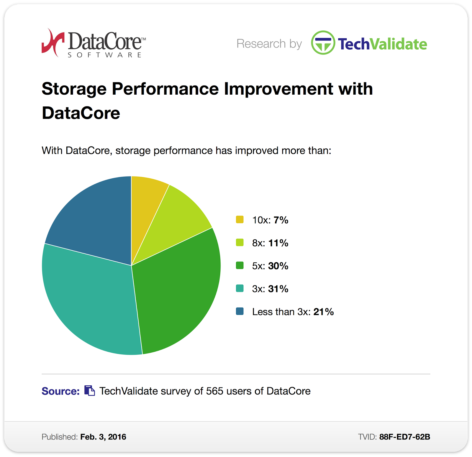 – 79 % der Kunden berichten von Leistungssteigerungen um mindestens das Dreifache; und nahezu die Hälfte der befragten DataCore-Kunden spricht sogar von Steigerungsraten um das Fünf- bis Zehnfache!