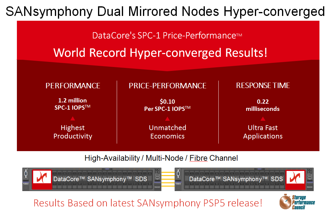 Utilisant l’indice de référence de stockage le plus reconnu dans l’industrie pour l’exécution des charges de travail de base de données d’entreprise, à savoir le test SPC-1 du Storage Performance Council, DataCore s’est appuyé sur les systèmes haut de gamme des baies de stockage externes classiques disposant d’une solution de serveur SAN Fibre Channel à deux nœuds, entièrement redondante, pour exécuter SANsymphony™ sa plateforme de services de stockage Software-Defined (SDS) sur une paire de serveurs Intel prêt à l’emploi.