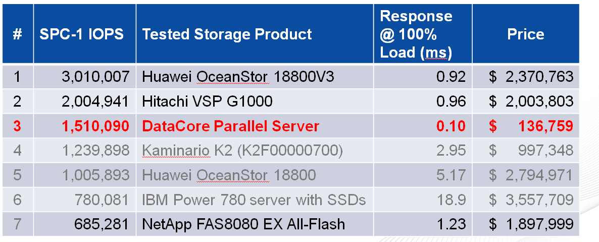 Le logiciel DataCore Parallel Server a obtenu la troisième place en matière de SPC-1 IOPS™, derrière deux systèmes coûtant plus de 2 millions de $. Seuls les systèmes Huawei OceanStor 18800V3 (à un prix total de 2 370 760 de $) et Hitachi VSP G1000 (à 2 003 803 $) ont obtenu de meilleurs résultats SPC-1 IOPS™ que la solution à 136 759 $ de DataCore. Contrairement à ces deux systèmes de stockage, qui fournissent uniquement des fonctions SAN externes, le logiciel DataCore Parallel Server a également exécuté les charges de travail de base de données de calcul d’entreprise et OLTP dans le même package compact.