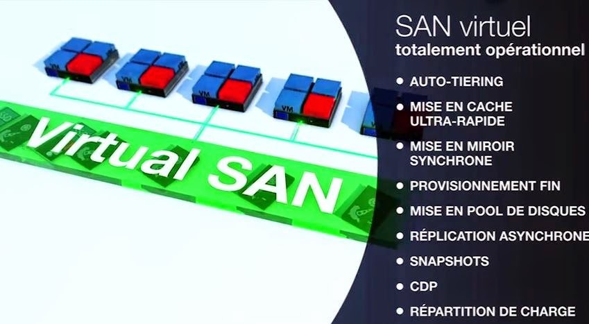 Le nouveau Virtual SAN de DataCore est une solution purement logicielle qui automatise et simplifie la gestion du stockage et le provisionnement tout en offrant une reprise automatisée et de meilleures performances. Virtual SAN est facile à configurer et à exécuter sur un serveur x86 nouveau ou existant pour créer un pool de stockage partagé à partir des ressources internes Flash et disque dont dispose ce serveur. Ceci permet de déployer de manière rentable un SAN virtuel DataCore en superposition, sans avoir à investir lourdement dans du nouveau matériel ou un système SAN complexe.